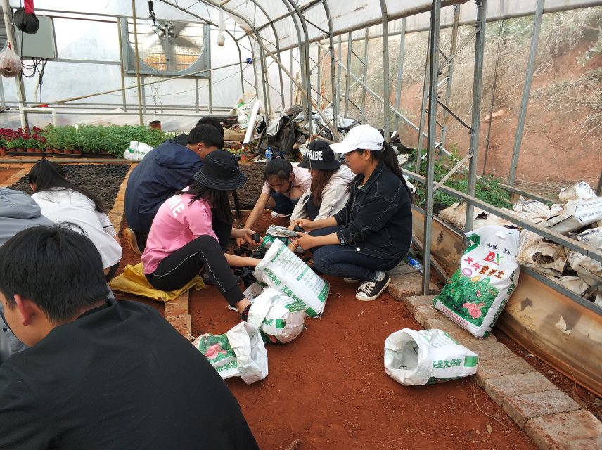 活动中同学们共分为三个小组,完成大棚内花卉栽培土准备、实验田间杂物清理和周围除草捡拾垃圾的任务。在实践过程中,每组同学都认真积极地完成自己的任务,并且每个人都能够在完成自己的任务后主动的去帮助其他同学。